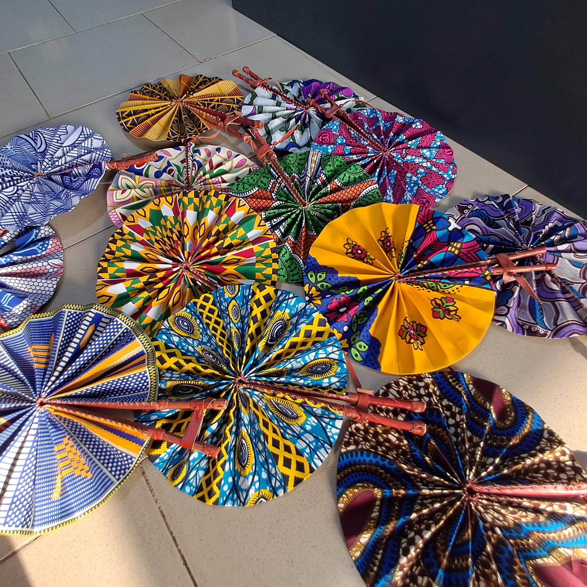 These fans are crafted from vibrant Ghanaian fabric and high-quality leather, making each one unique and visually striking.
