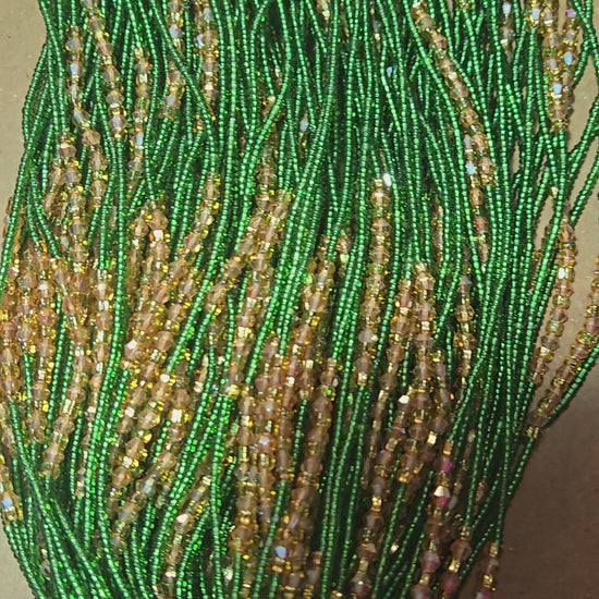 Brighten your collection with these beautiful handmade African waist beads. Featuring a Green glass bead base with gold crystal accents, each strand is 45 inches long and tie-